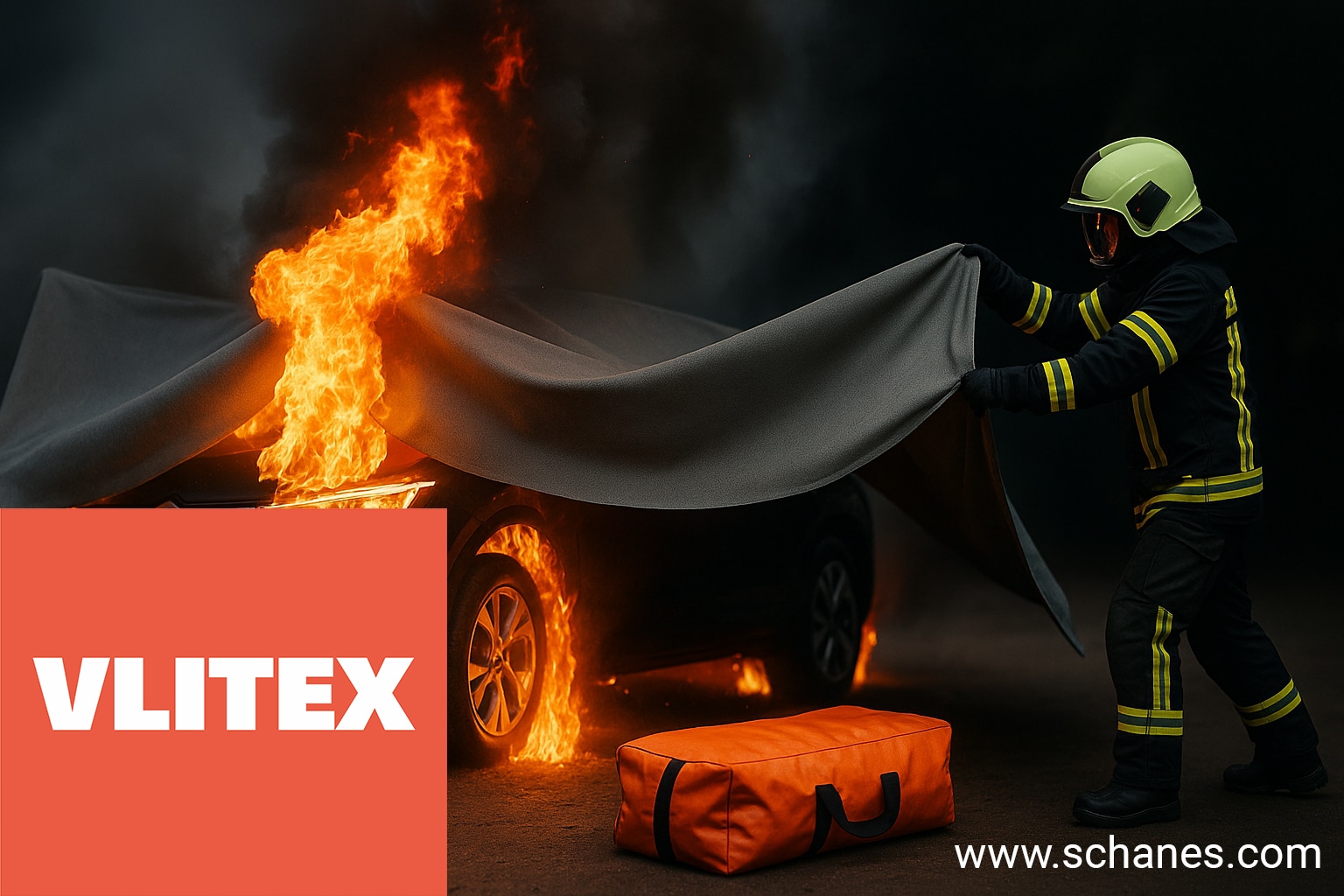 Die Vlitex Premium Brandbegrenzungsdecke E-Auto-48 6x8m u. 30kg ist die schnelle und effektive Lösung bei Fahrzeugbränden – Eine moderne Alternative zu herkömmlichen Löschmethoden.